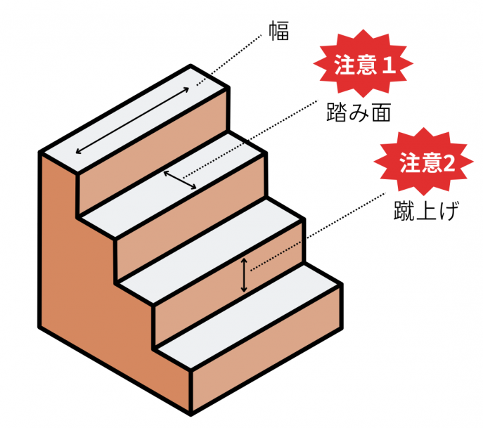 注意2・・・蹴上げの高さが段によって違うと踏み外しのもとになります。