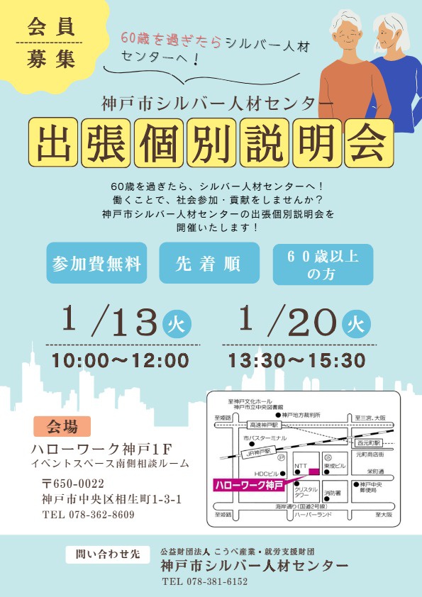 2025年12月22日(月) 【ハローワーク神戸 :1/13、1/20】シルバー人材センターの出張説明会を開催します! ハローワーク神戸のご協力を得て、神戸市シルバー人材センターの出張説明会を開催します。 シルバー人材センターでのお仕事に興味のある方は、是非ご参加ください。 事前申込は不要ですので、開催日の時間にあわせて直接会場にお越しください。