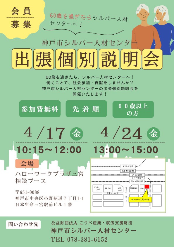 2026年04月01日(水) NEW 【ハローワークプラザ三宮 :4/17、4/24】シルバー人材センターの出張説明会を開催します! ハローワークプラザ三宮のご協力を得て、神戸市シルバー人材センターの出張説明会を開催します。 シルバー人材センターでのお仕事に興味のある方は、是非ご参加ください。 事前申込は不要ですので、開催日の時間にあわせて直接会場にお越しください。
